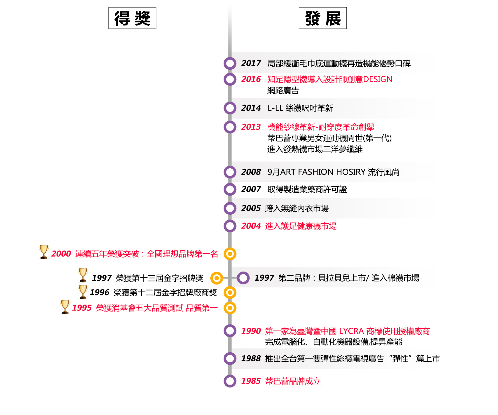 在臺灣經濟高速起飛的1990年代,消費意識覺醒對優質生活有無限期盼,當織襪市場全面停滯於品質不佳的尼龍絲襪時,蒂巴蕾創辦人洞察【品質高級化 產品多元化 流行國際化】的市場先機,率先投入【織造設備】與【原料紗線】產業革命,大舉購入義大利電腦織襪機台並與杜邦萊卡合作,成為臺灣第一也是華人市場第一的彈性絲襪製造商與銷售商,擦亮臺灣一躍與國際流行同步,持續至今