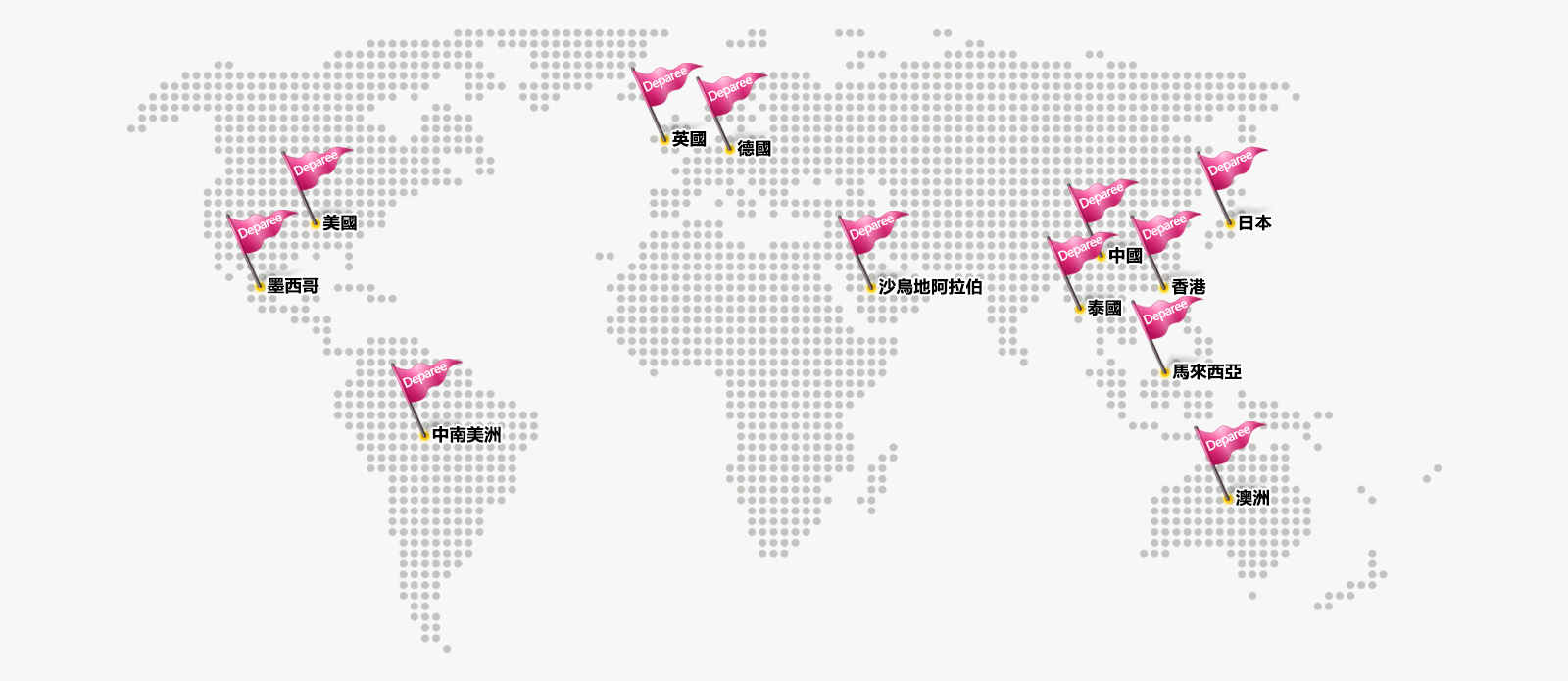 遍及美國 . 澳洲 . 墨西哥 . 香港 . 中國 . 日本 . 泰國 . 馬來西亞 . 英國 . 德國 . 沙烏地阿拉伯 . 中南美洲